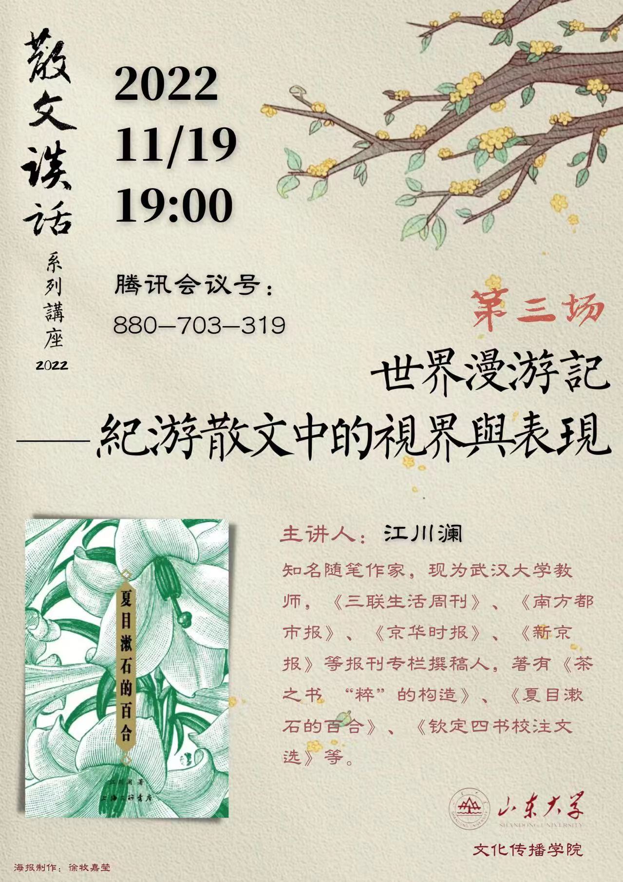 纪游写作在今天不仅仅是一种文学体裁,同时也成为人们日常生活普遍的记录与分享形式,纪游书写事实上在我国有着悠久的传统,上起六朝《兰亭集序》《洛阳伽蓝记》,下至明清《徐霞客游记》《登泰山记》,都是国人熟悉的经典作品。在古人的精神世界里,游记大抵不离山水之念及隐逸之思。但无论古今中外,我们必须承认游记是一种博览式写作,含风土人情与政治经济历史,可称包罗万象,最能从中看出作者的视域和见解,比如歌德、夏多布里昂、奈保尔、加藤周一,及当代著名游记作家保罗.索鲁、改了性别的简.莫里斯等等,讲座将围绕此展开阐述。