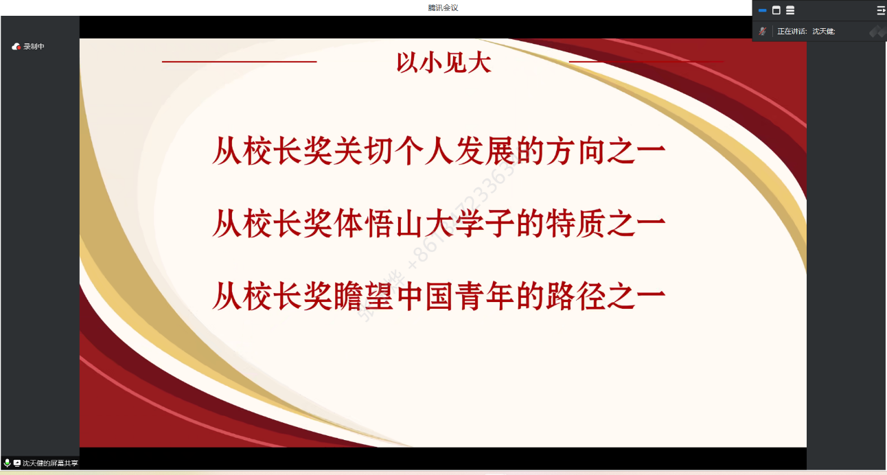 本次交流分享会分为经验分享和交流答疑两个环节。在分享环节中,两位同学均从校长奖的参评和竞选等方面分享了自己的经验和感受。曾舣灵从学业发展、创新创业以及答辩所需要注意的相关事项和技巧等方面入手,为大家分享了专业课程的学习方法和科研竞赛的选题思路,交流了所带团队“黄河源”调研团一路参加各类科研竞赛、社会实践并最终斩获“挑战杯”全国银奖的经历。沈天健则在详细介绍各类奖学金的特点和评选要求的基础上,重点介绍了发表学术论文的心得体悟,鼓励同学们努力提升综合素质,规划未来发展道路。