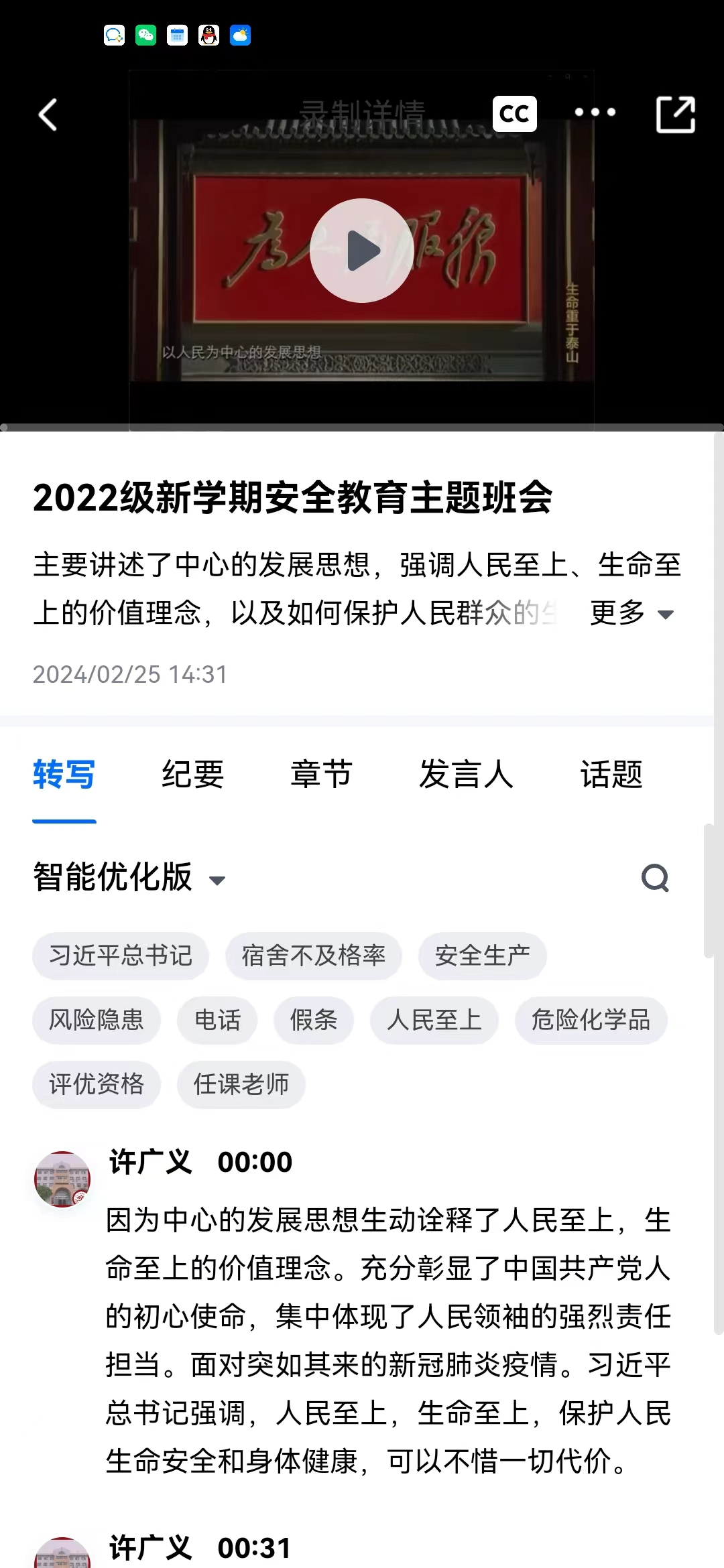 一、强化教育引导,上好开学“安全第一课”。新学期伊始,学院各年级辅导员通过线上线下相结合的方式面向全体学生召开新学期年级会,814名本科生、87名研究生全部参加。会上,辅导员们向学生讲解身心健康、宿舍安全、信息安全、交通安全、饮食安全、财产安全等各项安全知识,特别强调要注重电动车安全、防诈骗、实验室安全,提醒广大学生在骑行电动车时必须佩戴头盔,放慢速度,注意充电安全,严禁将电瓶、充电器带至宿舍内;要防范电信诈骗,严禁刷单,拒绝出租、出借、出售电话卡、银行卡和互联网账号,保护个人财产信息安全,捂好钱袋子;进入实验室要严格遵守实验室的各项规定,严格执行操作规程。此外,学生还集体观看了《生命重于泰山》宣传教育片,通过教育领域发生的事故典型案例以案说法,使学生真正汲取教训、受到警醒。