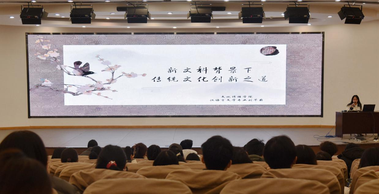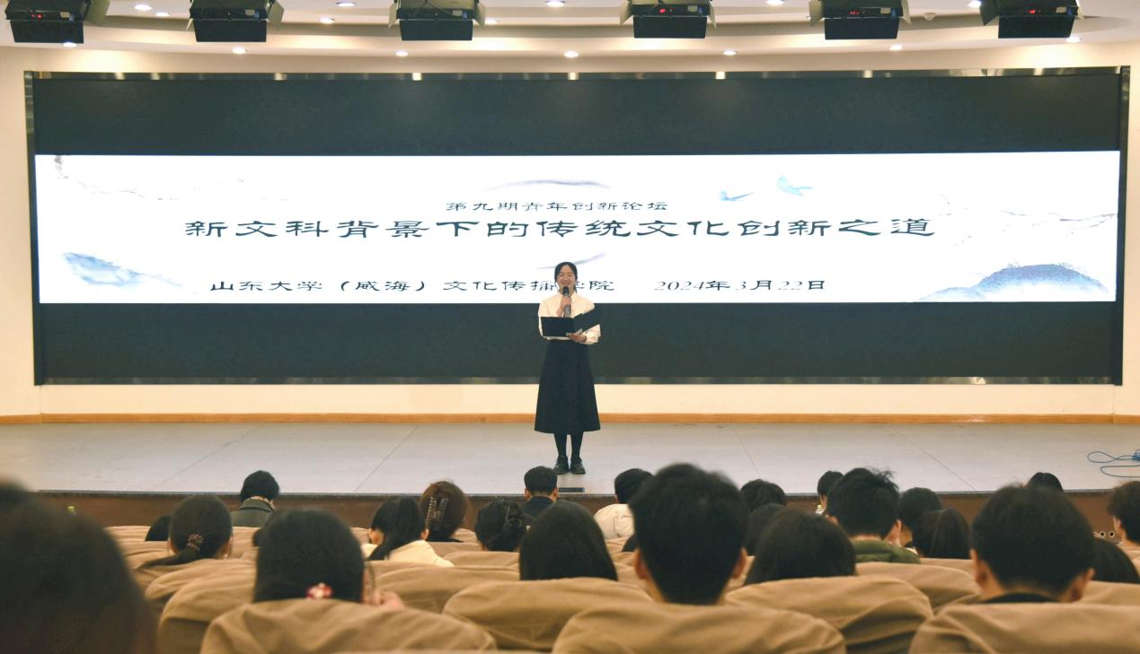 本站讯 3月22日下午,由校区团工委主办、世俱杯买球官网网站团委承办的第九期青年创新论坛在玲珑学堂举行。本次论坛以“新文科背景下的传统文化创新之道”为主题,世俱杯买球官网网站副教授朱新林、山东融媒文化传媒有限公司总经理兼世俱杯买球官网网站业界导师张利然、世俱杯买球官网网站学生刘芊蔚、诸昱辰作为参会嘉宾到场分享相关经验,活动由世俱杯买球官网网站2022级本科生向余主持,学院辅导员白孟灵和部分同学参与本次论坛。